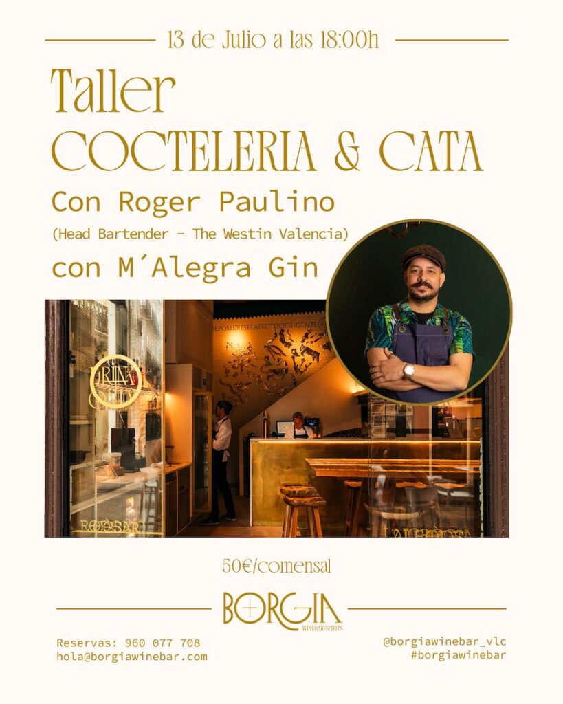 Borgia Wine Bar & Spirits, el templo del hedonismo en pleno corazón del barrio del Carmen, anuncia un evento exclusivo: un Taller de Coctelería y Cata el próximo 13 de julio a las 18:00h, de la mano del prestigioso bartender Roger Paulino (Head Bartender de The Westin Valencia), y la colaboración estelar de M’Alegra Gin, la ginebra que está conquistando la escena valenciana.