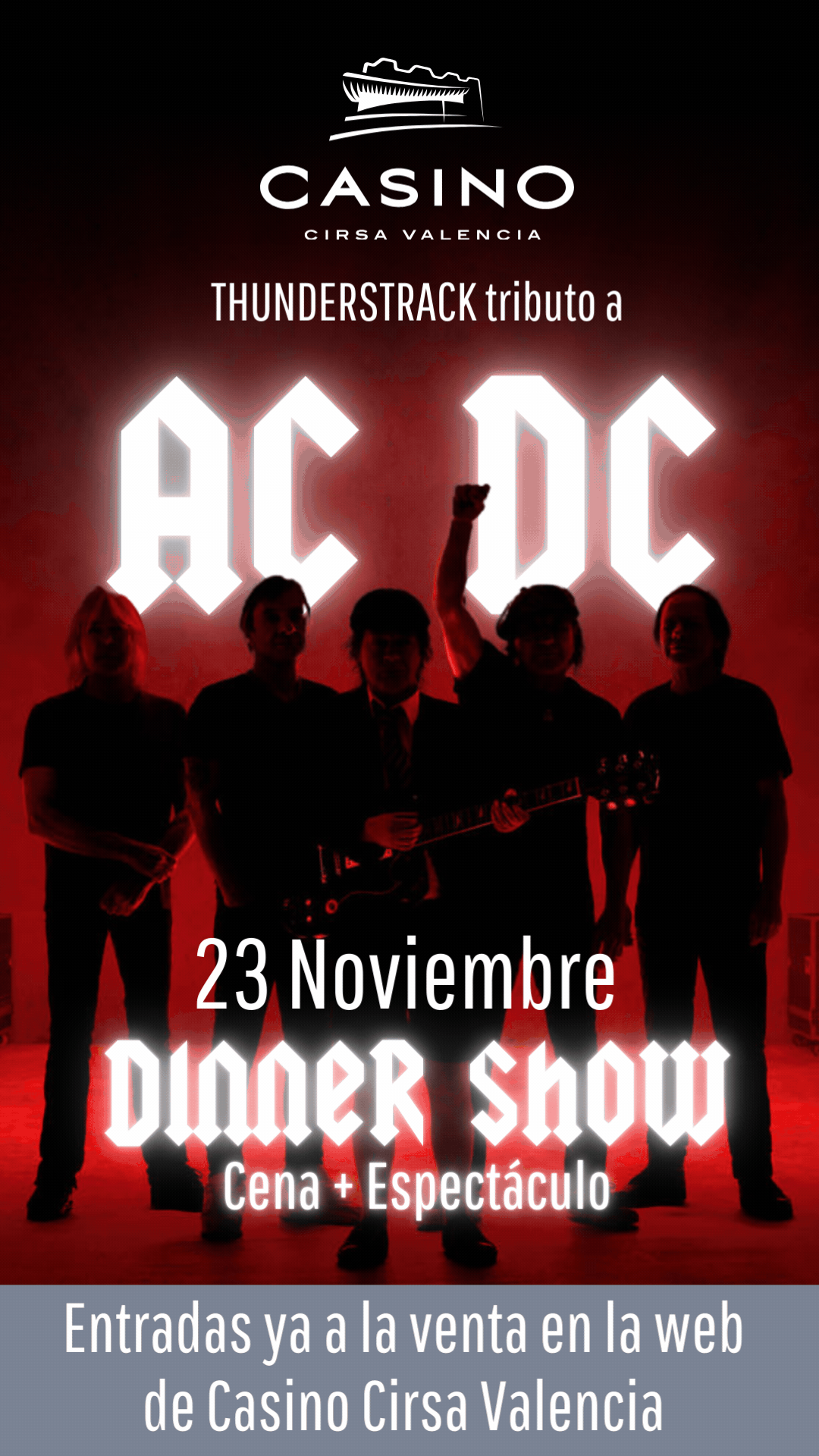 Si eres amante del rock y estas en Valencia estas de enhorabuena: el Casino CIRSA Valencia te ofrece una experiencia que fusiona lo mejor de la música en directo y una cena exquisita en un homenaje musical único a AC/DC. El Dinner Show tributo de la banda Thunderstrack invita a los asistentes a disfrutar de una velada inolvidable, llena de energía, grandes éxitos y auténtica pasión por el rock.