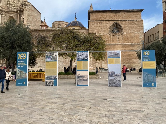 La asociación de hostelería del Paseo de Neptuno inicia con esta exposición los actos culturales de conmemoración del centenario. La muestra, comisariada por el periodista Paco Varea, consta de cinco postes y 15 paneles que recorren fotográficamente las primeras barracas de baño, la época de la II República, la Guerra Civil, la postguerra y la etapa democrática, cuando se construyó el actual paseo marítimo de la ciudad, obra de los arquitectos Miguel Colomina y Juan Luis Piñón.