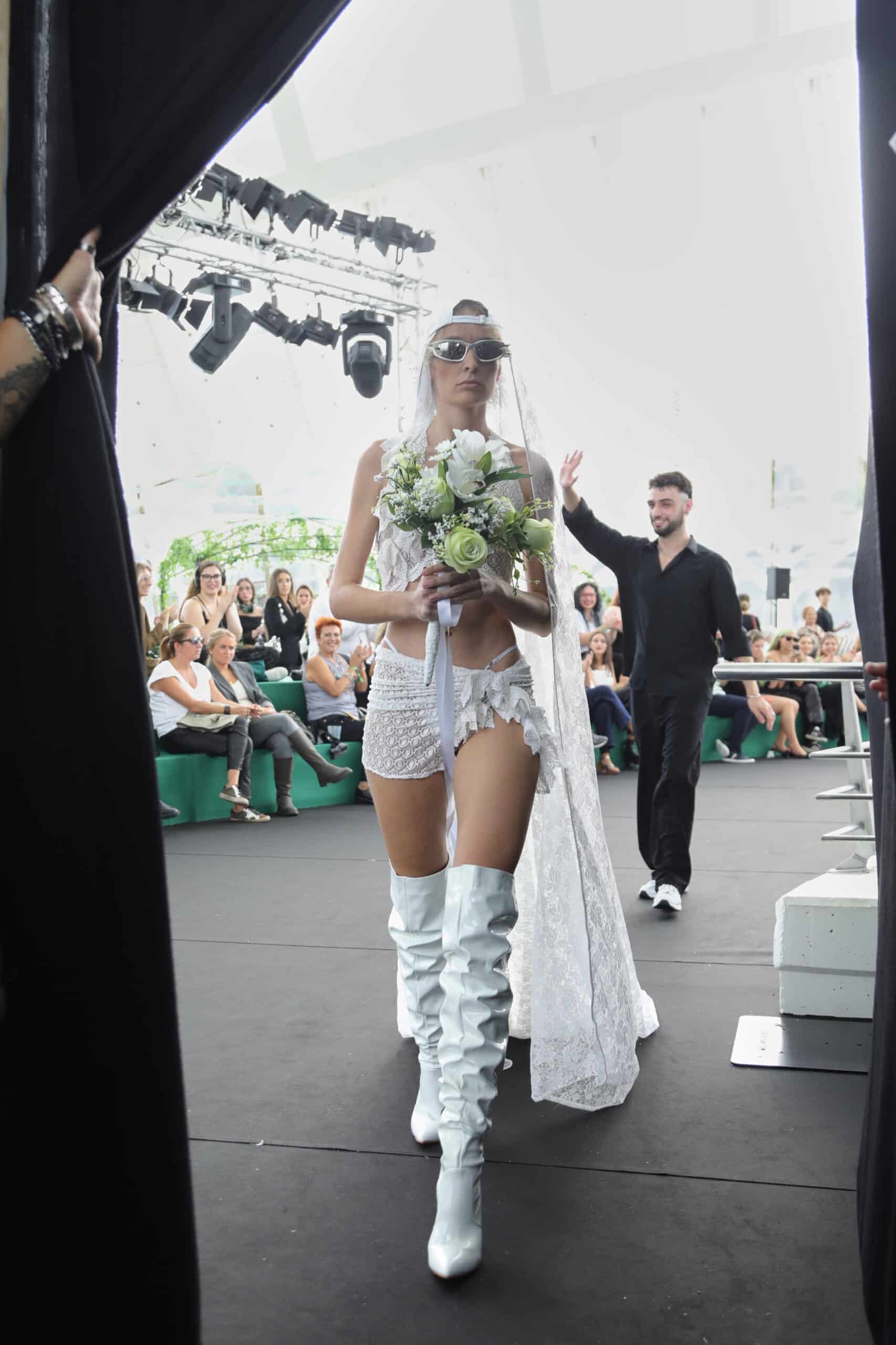 Fabiola Ricci, que con ese despliegue impecable de volúmenes y juego de transparencias demostró que arriesgar no significa perder la esencia. Andrés la Carcel se reinventó con prendas acolchadas, pelo sintético en una cazadora y una personalidad transgresora que se transmitió en sus diseños. El universo Diego de Viedma sorprendió con máscaras de gas, capas con hombreras y peinados extravagantes. Steven Vázquez presentó una línea que jugaba con los estereotipos de género con la canción de Miley Cyrus, “I can buy myself flowers”, como punto de partida. Adriana Strada apostó por la sostenibilidad y la elegancia, aunque con un toque de rebeldía. Rosa Gasset, la creadora de Devol, quiso transmitir su concepción del amor. Genis Betrian nos desafió con prendas negras exquisitas mezcladas con la cultura techno. Estructuras marcadas y correas fueron la apuesta de Samurai San, quien se encargó de cerrar el grupo de Noveles Meta y Noia.