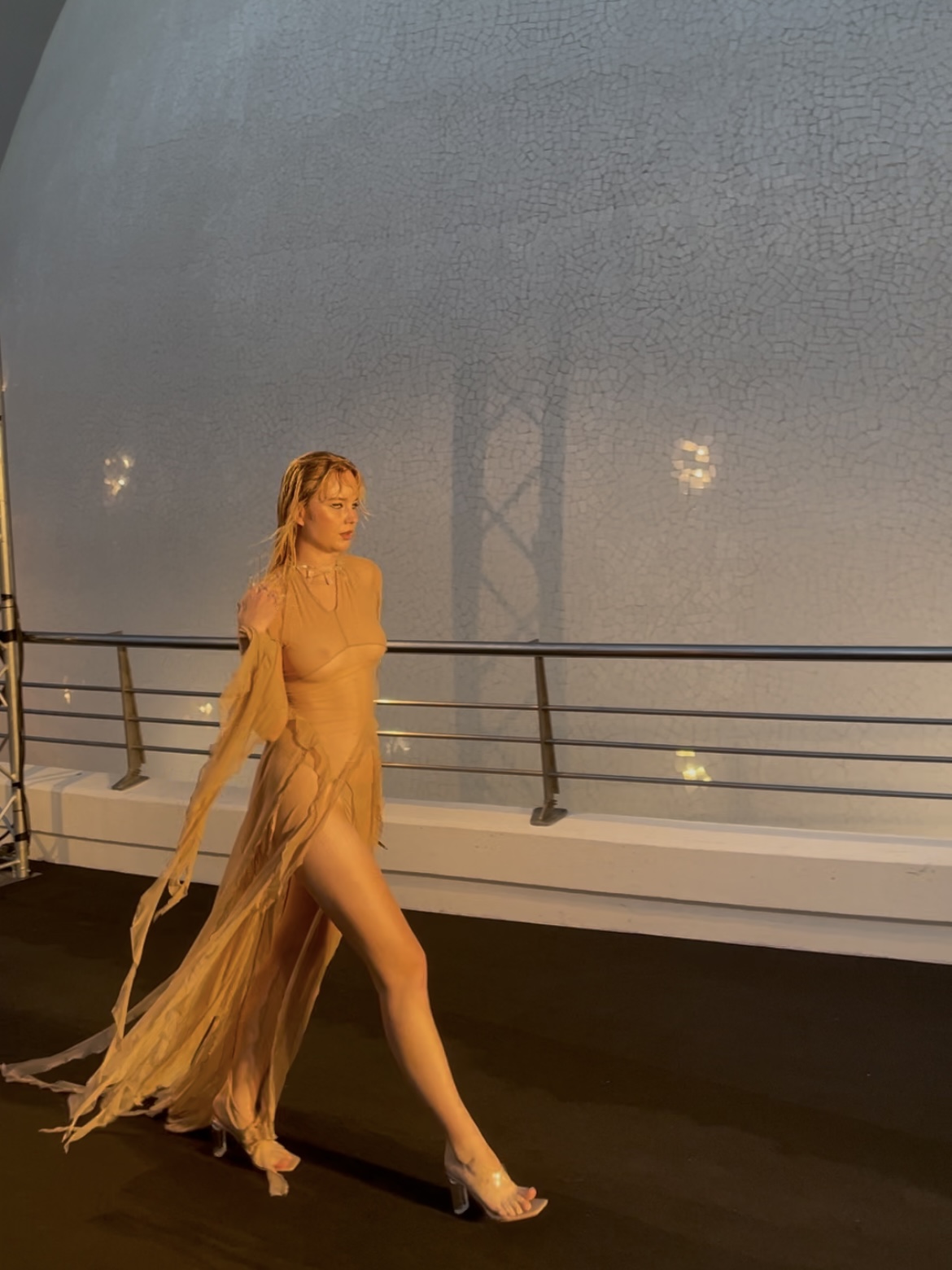 Alineo Studio creó una atmósfera etérea con apliques brillantes, copas de cristal que reflectaban la luz y unas modelos con un pelo efecto mojado que recordaban a sirenas recién salidas del agua.