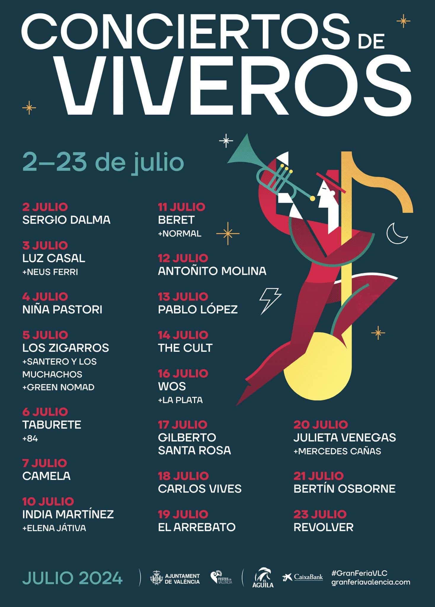 La programación de Conciertos de Viveros da comienzo con la primera de las 18 jornadas musicales que reunirán en total a 25 artistas en este ciclo musical. Ya habitual en las noches de verano de Valencia, enmarcado dentro de la Gran Feria de Julio de Valencia. Organizado por la Concejalía de Fiestas y Tradiciones del Ayuntamiento de Valencia y que tendrá lugar en los Jardines de Viveros, pulmón verde de la ciudad con capacidad para recibir 5000 asistentes por día.
