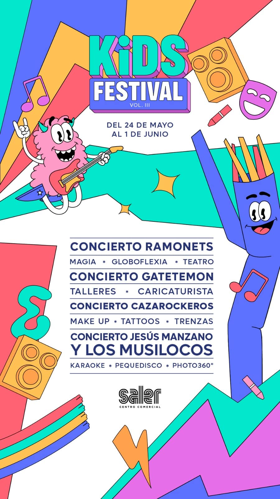 El primer día del Kids Festival arranca con la actuación musical de los Cazarokeros, el grupo de música que versiona canciones míticas de los villanos de las películas, y termina con la sesión del Mago Juanjo, quien hará que los niños y niñas se sorprendan con sus trucos de magia. El sábado, 25 de mayo, desde por la mañana, las familias podrán disfrutar de un taller de wafles, un teatro de serpentina, y por la tarde, una fiesta inspirada en una discoteca, la “pequedisco”, así como caricaturas y un karaoke. Además, habrá una actuación del grupo Gatetemon, el grupo que toca canciones de series y películas de la infancia para que tanto niños como adultos disfruten de la fiesta.