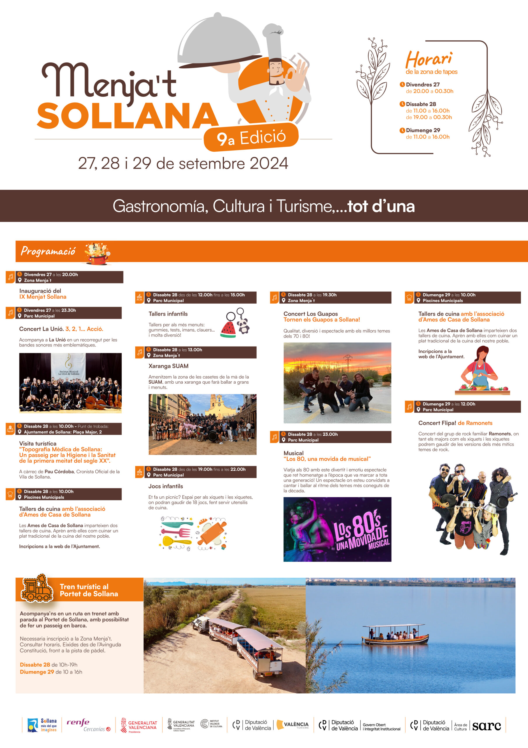 El evento gastronómico y cultural por excelencia de Sollana celebra este año su novena edición con un fin de semana lleno de actividades que buscan destacar la riqueza cultural, turística y gastronómica de la localidad y sus alrededores. El Menja’t Sollana ofrece a sus visitantes una atractiva mezcla de propuestas gastronómicas, lúdicas y culturales, convirtiendo durante este fin de semana esta localidad de la Ribera Baja en un interesante foco de atracción para la comarca.