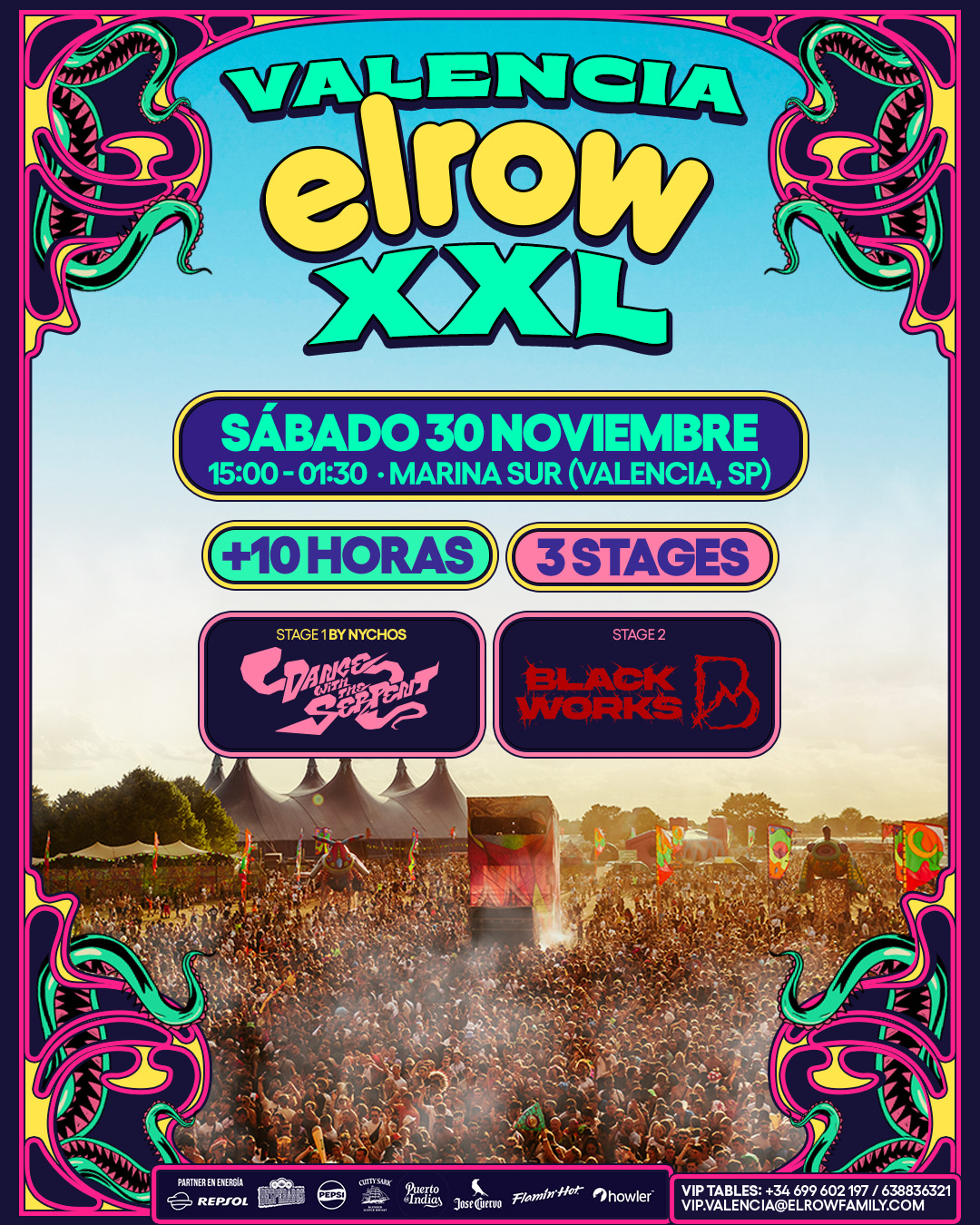 El festival contará con tres escenarios únicos, cada uno con su propio ambiente y estilo musical. En primer lugar, el escenario principal de elrow presentará la nueva temática “Dance with the Serpent”, creada por el renombrado artista austriaco Nychos, que promete una experiencia visual y sonora impactante. Además, los asistentes podrán sumergirse en el vibrante escenario de Blackworks, donde sonará lo mejor del Techno y Hard Techno de la escena electrónica más actual, con los ritmos más intensos y potentes del festival. Por último, el tercer escenario, aún por revelar, promete complementar la variada propuesta audiovisual y musical.