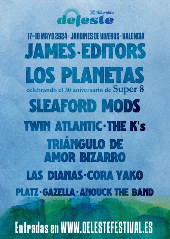 La duodécima edición de Deleste Festival, a celebrar los próximos 17, 18 y 19 de mayo en los Jardines de Viveros de Valencia, confirma la presencia de Los Planetas, que celebrarán el 30º aniversario de su legendario primer disco “Super 8”, interpretándolo íntegramente sobre las tablas el domingo, jornada final del festival. Dos promesas de la escena nacional como las granadinas Las Dianas y los valencianos Platz se añaden a un fantástico cartel que ya incluía a James, Editors, Sleaford Mods, Triángulo de Amor Bizarro, The K’s, Twin Atlantic, Cora Yako, Gazella y Anouck The Band. Nombres veteranos y talento emergente, tanto nacionales como internacionales, combinados en un festival boutique y urbano, con un único escenario sin conciertos solapados pero con actividades paralelas en otros espacios emblemáticos de la ciudad, todo bajo el radiante sol del Mediterráneo. Un festival, pues, único en Valencia.