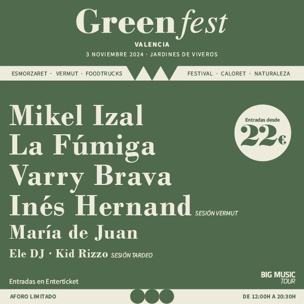 El Green Fest 2024 contará con la participación de reconocidos artistas y bandas como Izal, uno de los grupos más icónicos del indie español, y La Fúmiga, los referentes valencianos de la música festiva y reivindicativa. Además, la música se complementará con la actuación de la talentosa cantante María de Juan, cuya propuesta artística combina pop, jazz y soul.
