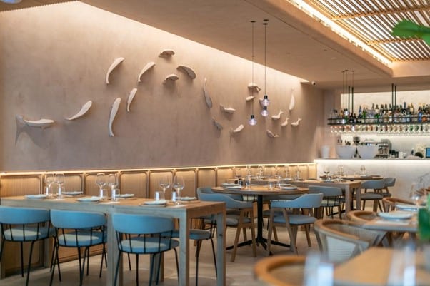 Los azules del mar, cuando combinan con los del cielo, se convierten en un cuadro. Acercarlos hasta el restaurante era una necesidad. Lo han hecho a través de unos amplios ventanales -si se abren, permiten entrar en la atmósfera de Portolito Playa- y un tragaluz, el cual consigue que la luz natural traspase a la sala, cuya pared cubre un banco de peces muy original. Esta conduce a un reservado y, un poco más allá, a una cocina abierta al pasillo. El broche de oro lo pone el asador, por el que pasarán todas las carnes, pescados, mariscos y verduras.