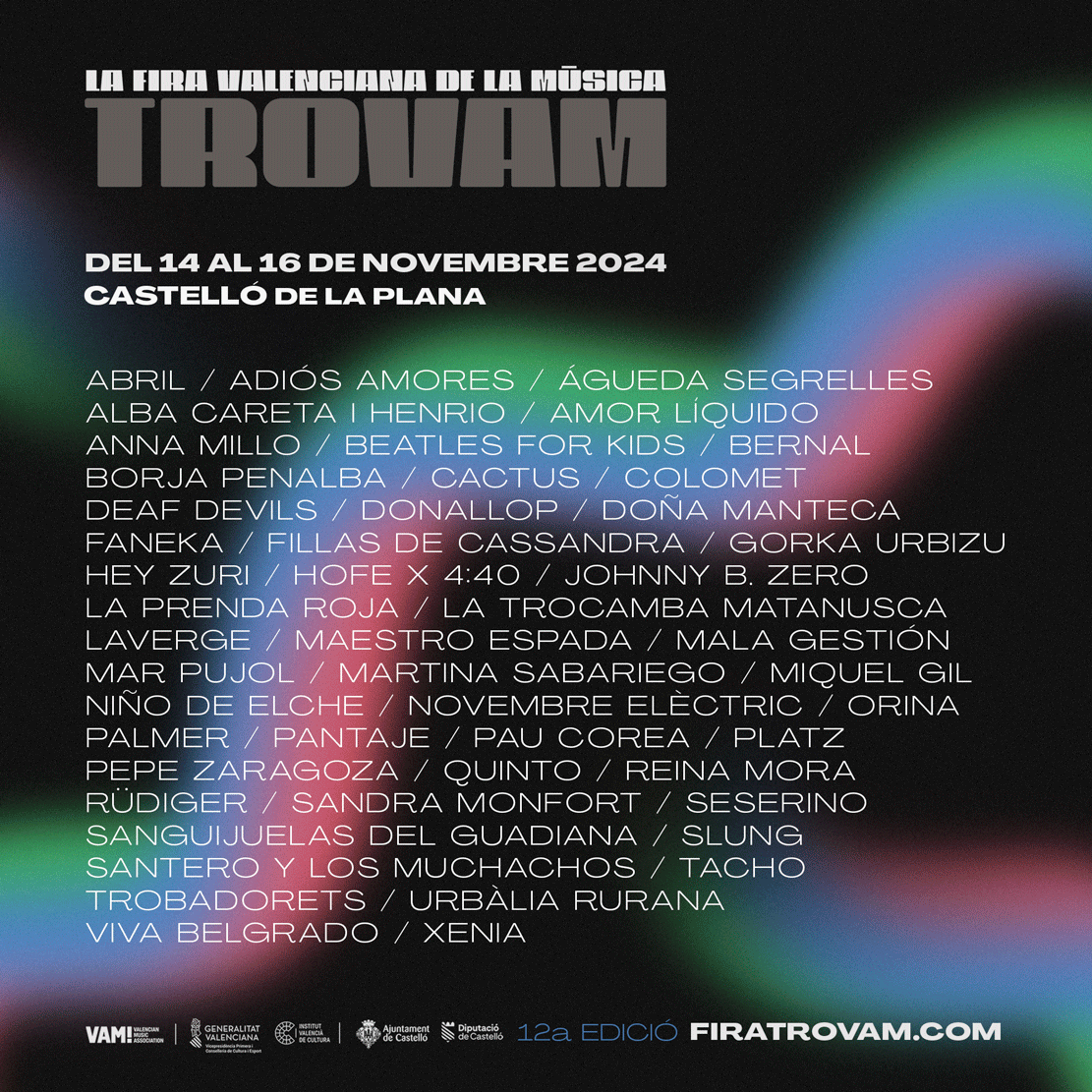 La duodécima edición de la Fira Valenciana de la Música Trovam 2024 se celebrará entre el jueves 14 y el sábado 16 de noviembre en Castellón de la Plana. Un año más, el evento será posible gracias al tejido de alianzas y colaboraciones forjadas desde la Valencian Music Association (VAM!). Ya que es la principal entidad organizadora del Trovam en compañía de la Conselleria de Educación, Cultura, Universidades y Empleo a través del Institut Valencià de Cultura (IVC).