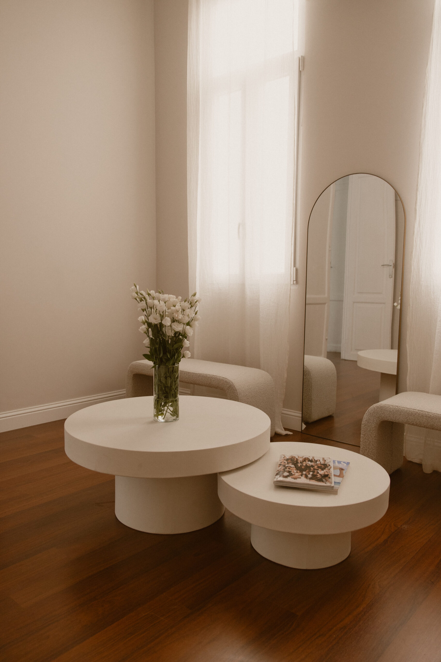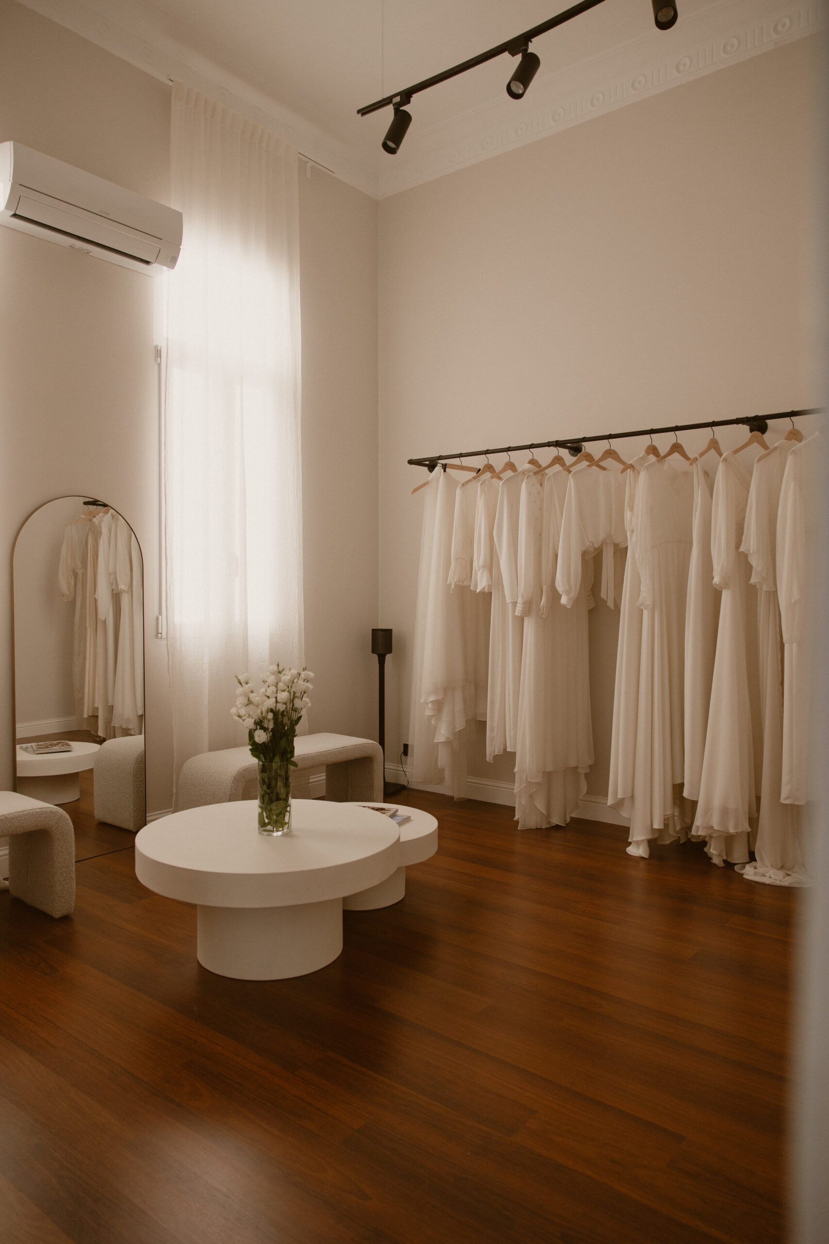 El nuevo atelier cuenta con dos amplios salones de pruebas, donde principalmente reciben a sus clientas más frecuentes, las novias. Además, el espacio incluye un despacho y una sala showroom, donde exponen algunos de los modelos más destacados de sus colecciones anuales, a modo de inspiración para futuras creaciones. Sin embargo, la colección no está destinada a la venta directa al público, sino que se presenta como una ventana al estilo y los valores de la marca.