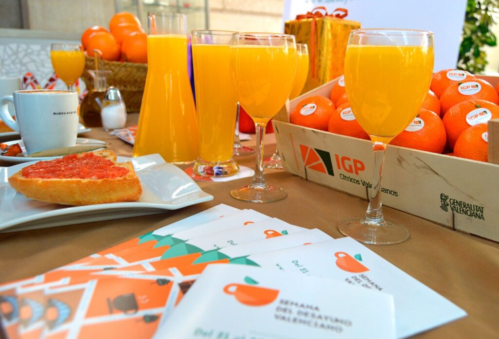 Otro dato significativo es que, por primera vez, la Semana de Desayuno Valenciano se expande más allá de la provincia Valencia y alcanza a toda la Comunitat, porque también Castellón y Alicante presumen de producción citrícola. Del 9 al 13 de diciembre, todas las personas que tomen su desayuno valenciano (café, leche o infusión y una tostada de aceite o de tomate) en los locales adheridos, repartidos por todo el territorio autonómico, serán obsequiadas con un zumo natural, elaborado a partir de naranjas autóctonas de la variedad Navelina, certificadas por la IGP Cítricos Valencianos.
