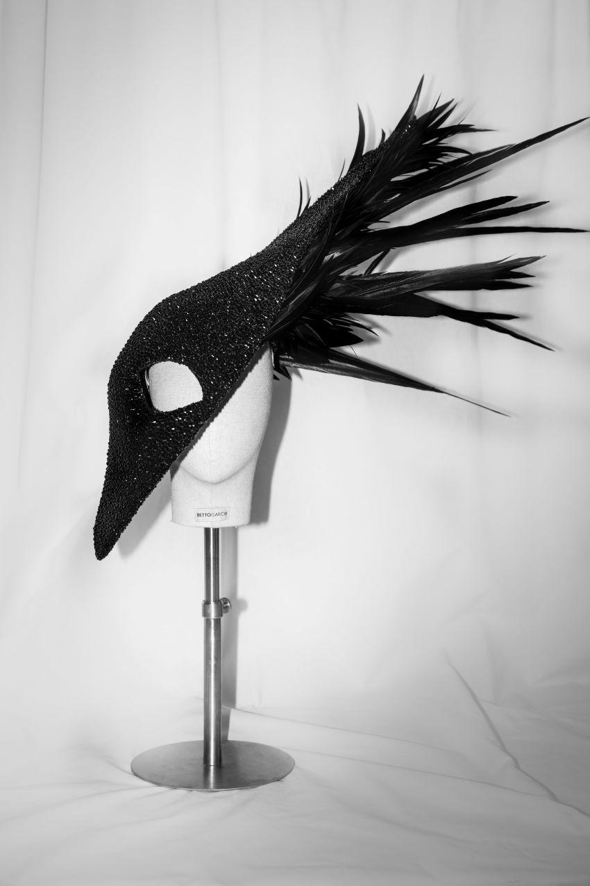 Desde el principio, Betto tuvo claro que la pieza debía jugar con la idea de un sombrero-antifaz, pero fue un reto. “El mundo de la moda es frenético, y cuanto más escalas, más lo es. Todo fueron ajustes y pruebas a distancia, con unos tiempos ajustadísimos”. El resultado: un tocado estilo antifaz asimétrico, bordado con cristales y adornado con plumas extralargas que aportaban una dimensión hiperbólica y teatral a la pieza.