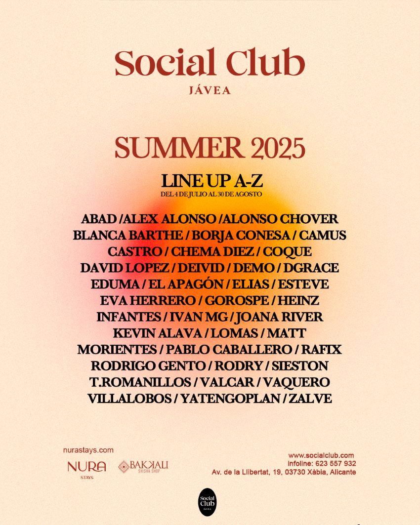 A partir del 4 de julio, Social Club Jávea abrirá sus puertas cada noche, de lunes a domingo, con una programación cargada de música y experiencias. Sobre el escenario pasarán algunos de los DJs más destacados del panorama nacional, como Valcar, Lomas, Carlos Esteve, Blanca Barthe, Elías, Joana River, Iván MG, Camus, Kike DGrace, Luis Abad, Mike Marín, Alonso Chover, Rodry Soler, Chema Diez, Rodrigo Gento, Rafix, Borja Conesa, Villalobos, Matt y muchos más. La programación incluirá también colaboraciones especiales y activaciones con marcas que ven en este espacio un escaparate estratégico para conectar con el público estival.