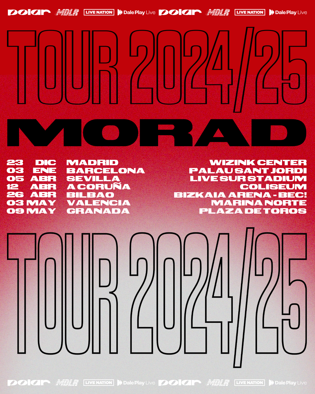 Morad, el joven fenómeno de la escena urbana, anuncia nuevos conciertos para su gira de arenas el próximo año. El artista añade a las fechas ya anunciadas el 23 de diciembre en el WiZink Center de Madrid y el 3 de enero en el Palau Sant Jordi de Barcelona, nuevos conciertos el 5 de abril en el Live Sur Stadium de Sevilla, 12 de abril en el Coliseum de A Coruña, el 26 de abril en el Bizkaia Arena BEC! de Bilbao, el 3 de mayo en la Marina Norte de Valencia y el 9 de mayo en la Plaza de toros de Granada.