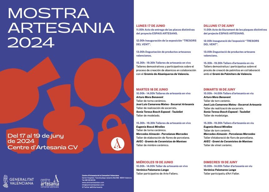 El Centro de Artesanía invita a todos a disfrutar de una experiencia única, llena de creatividad, tradición y solidaridad. ¡No te pierdas la Mostra Artesania 2024! Podrás conocer la rica tradición artesanal de la Comunitat Valenciana y participar en actividades para toda la familia. Para más información sobre horarios y reservas, visita el sitio web del Centro de Artesanía de la Comunitat Valenciana.