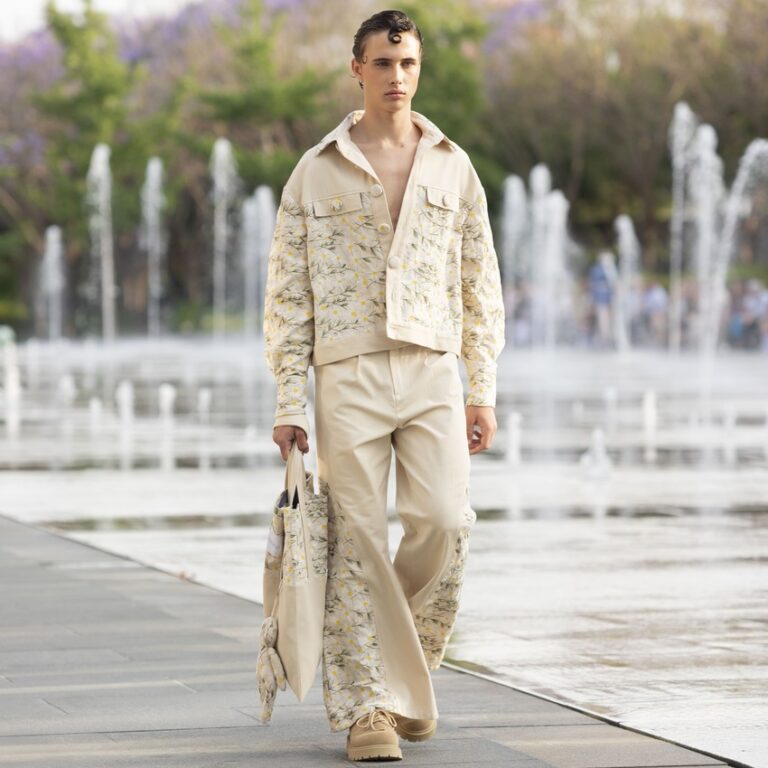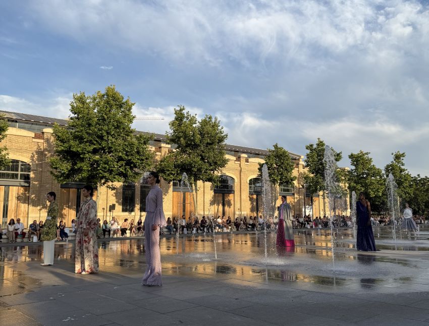 La puesta en escena convirtió la Nave 3 del Parc Central en un universo suspendido entre la realidad y lo onírico. Rodeado de fuentes de agua, el espacio se transformó en un paisaje sensorial donde la naturaleza dialogaba con la moda. Una banda sonora envolvente —elegida con precisión para la ocasión— reforzaba la atmósfera.