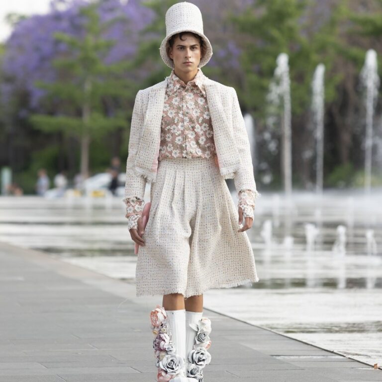 Inspirada en un paseo en barca, la muestra fue un despliegue de tejidos vaporosos que parecían flotar, lazos que dialogaban con flores en tonos pastel y siluetas alejadas del binarismo para abrazar lo etéreo. Benavente se mostró fiel a su estética: tonos empolvados, piezas artesanales, una confección meticulosa y una identidad clara que se va consolidando con los años.