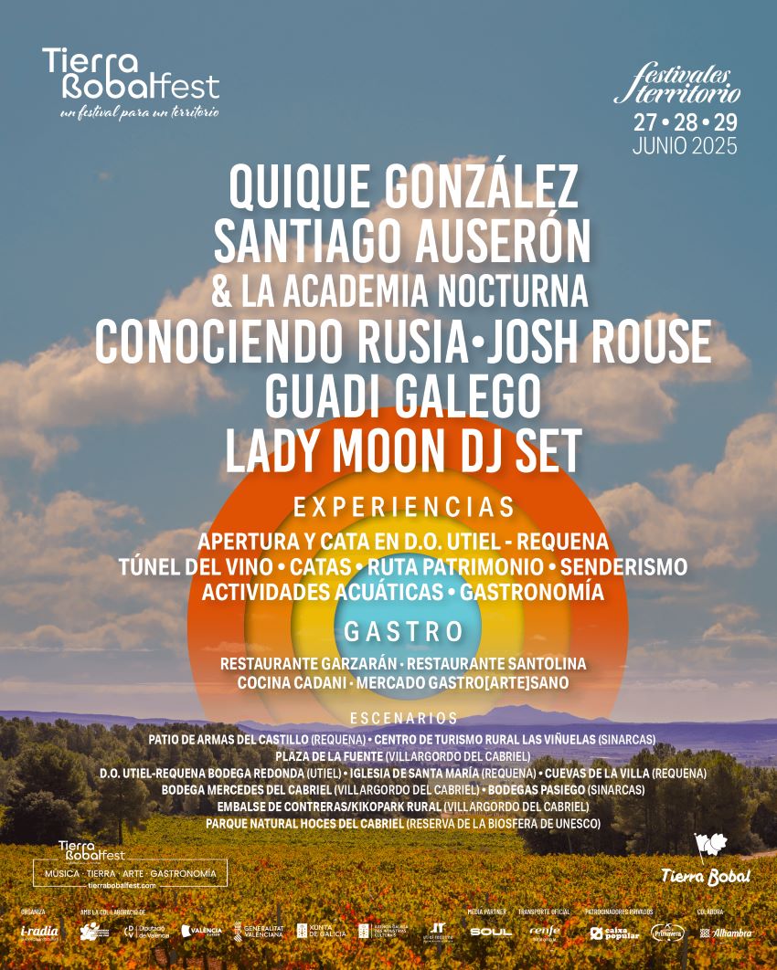 La tercera edición de Tierra Bobal Fest cuenta con la colaboración de Mancomunidad Interior Tierra del Vino, y el respaldo de la Generalitat Valenciana, Diputación de Valencia y Xunta de Galicia. También apoyan esta edición entidades como Caixapopular, Fuente Primavera y Cajamar. Renfe será el Transporte Oficial del evento. Consulta toda la programación, experiencias y venta de entradas aquí.