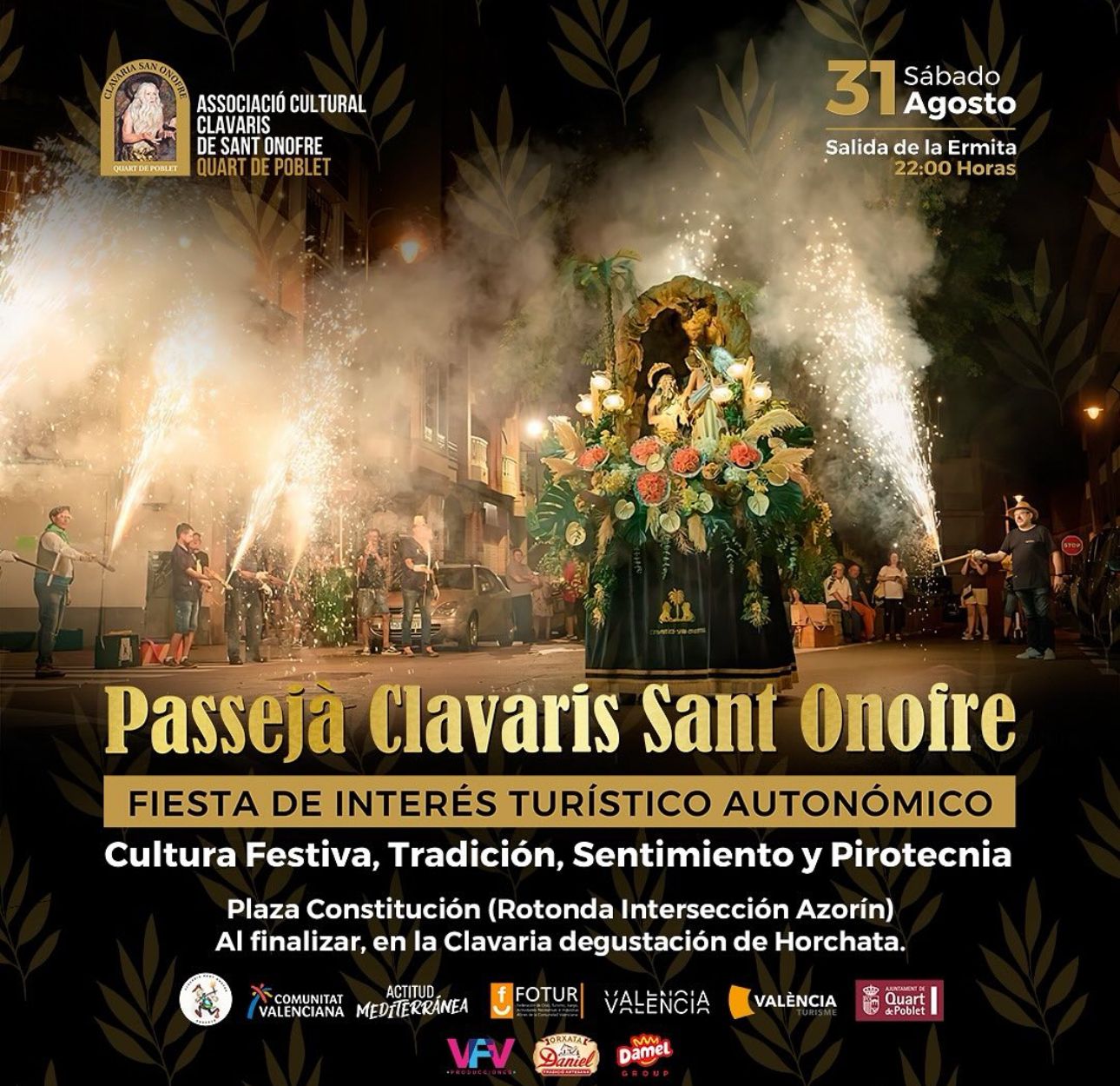 En cuanto al sábado 31 de agosto, vuelve la “Passejà de Sant Onofre”, a cargo de los Clavarios de Sant Onofre. Tradicional cultura festiva en honor al patrón de Quart de Poblet y que este año es una edición muy especial al haber sido declarada fiesta de interés turístico autonómico.